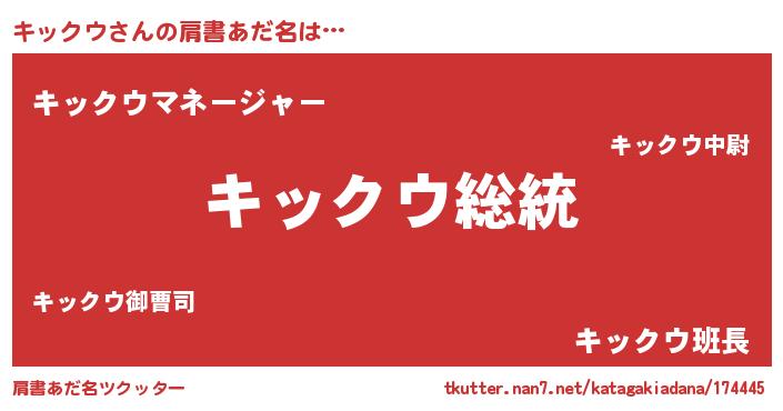 | 男性向けラノベタイトル風あだ名 | 『Re:キックウから始める異世界生活』 |