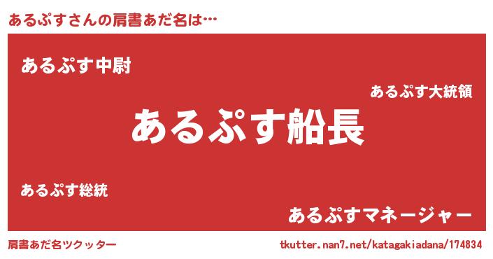 | 男性向けラノベタイトル風あだ名 | 『うちのあるぷすが世界を掌握している!』 |
