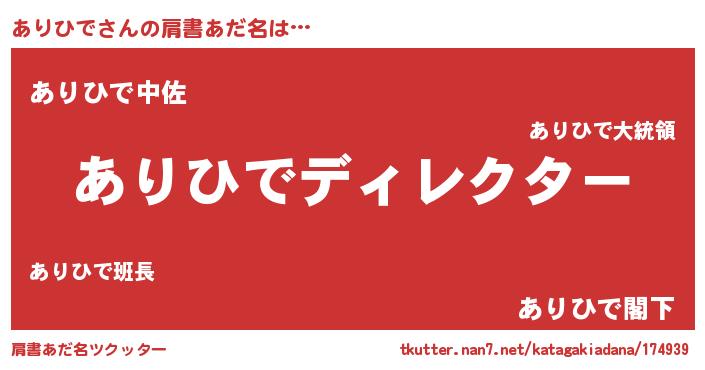 | 男性向けラノベタイトル風あだ名 | 『ありひでに滅ぼされるだけの簡単なお仕事です』 |