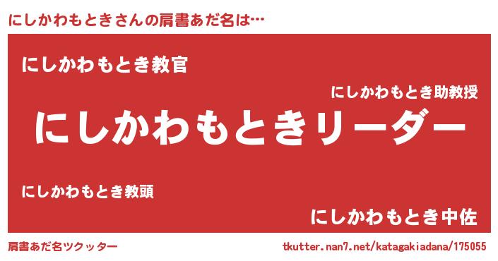 | 女子向けラノベタイトル風あだ名 | 『にしかわもときは平凡を望む』 |