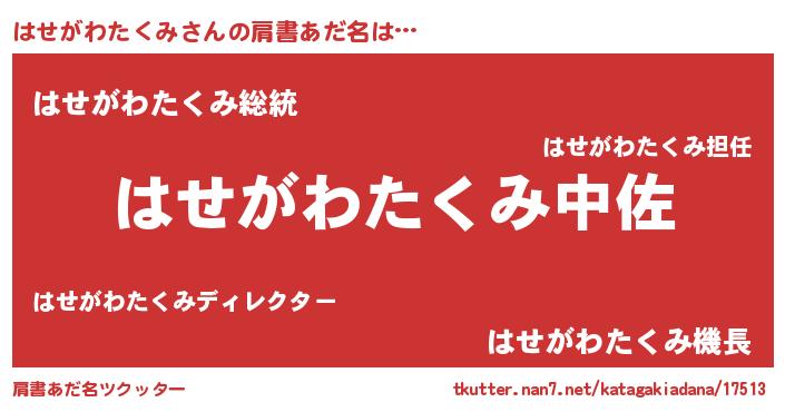 | ヘコむあだ名 | 『はせがわたくみ(笑)』『はせにゅー』 |