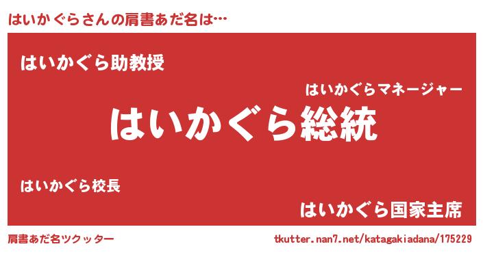 | 意味不明あだ名 | 『自称はいかぐら』『永久保存はいかぐら』 |