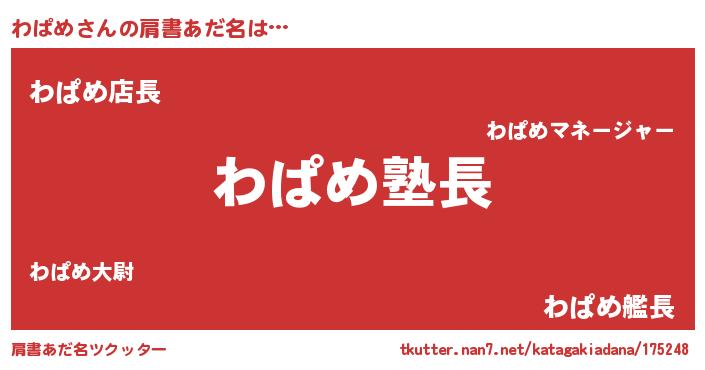 | 男性向けラノベタイトル風あだ名 | 『わぱめの嫁は女の子じゃないと思った?』 |