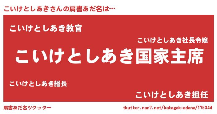| 女子向けラノベタイトル風あだ名 | 『こいけとしあきの雑貨屋さん』 |