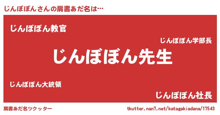 | 男性向けラノベタイトル風あだ名 | 『じんぼぼんという概念が存在しない退屈な世界 』 |
