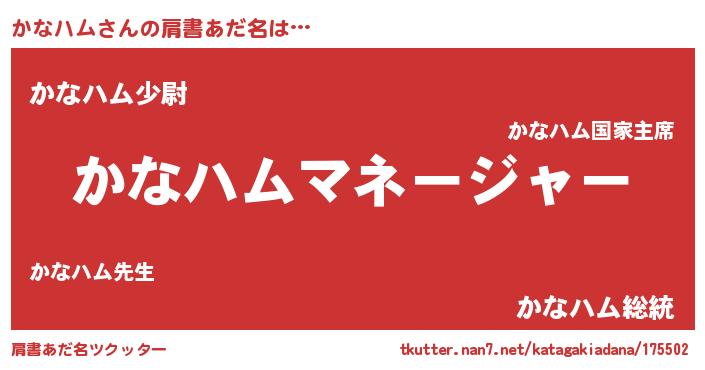 | 男性向けラノベタイトル風あだ名 | 『かなハムに滅ぼされるだけの簡単なお仕事です』 |