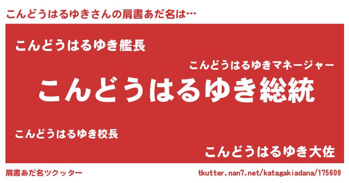 | 男性向けラノベタイトル風あだ名 | 『Re:こんどうはるゆきから始める異世界生活』 |