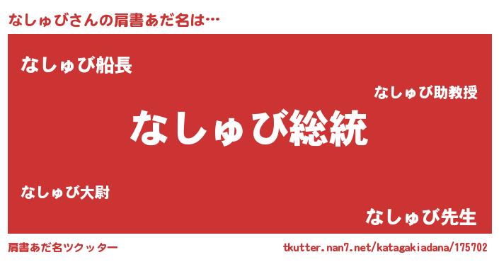 | 男性向けラノベタイトル風あだ名 | 『Re:なしゅびから始める異世界生活』 |
