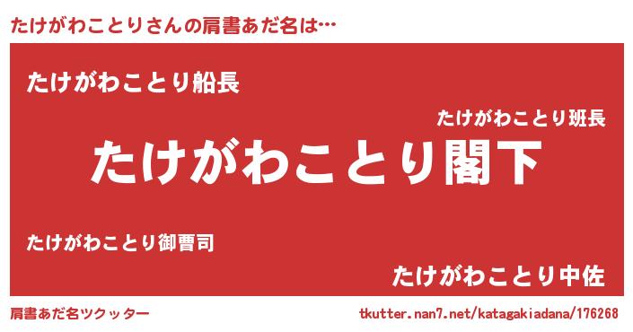 | 男性向けラノベタイトル風あだ名 | 『Re:たけがわことりから始める異世界生活』 |