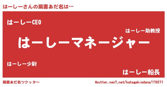 | 男性向けラノベタイトル風あだ名 | 『はーしーに滅ぼされるだけの簡単なお仕事です』 |
