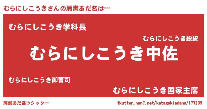 | 男性向けラノベタイトル風あだ名 | 『むらにしこうき~年齢イコール彼女いない歴の魔法使い~』 |