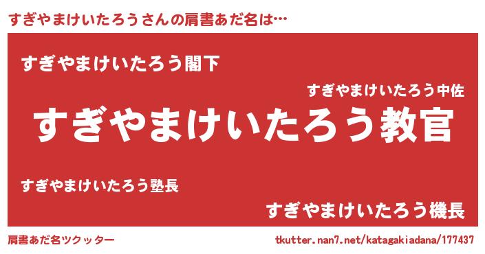 | 男性向けラノベタイトル風あだ名 | 『魔弾の王とすぎやまけいたろう』 |