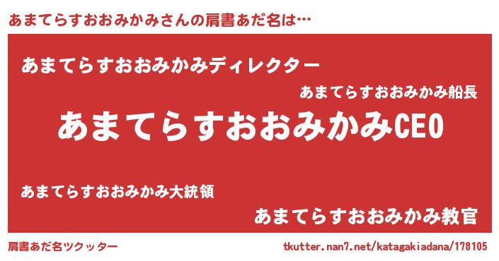 | 男性向けラノベタイトル風あだ名 | 『アマテラスオオミカミアートオンライン』 |