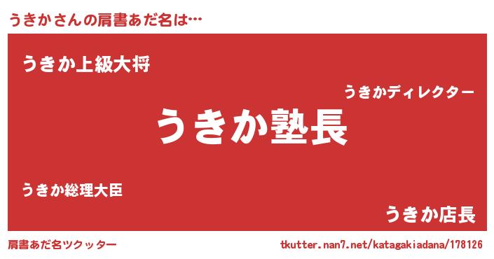| 女子向けラノベタイトル風あだ名 | 『うきか様がみてる』『うきか伯爵の花嫁』 |