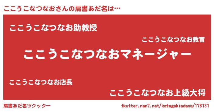 | 男性向けラノベタイトル風あだ名 | 『ここうこなつなおに滅ぼされるだけの簡単なお仕事です』 |
