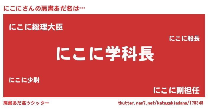 | 女子向けラノベタイトル風あだ名 | 『死神にこにの再婚』『にこに伯爵の花嫁』 |