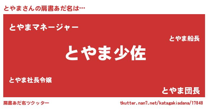 | 男性向けラノベタイトル風あだ名 | 『とやま~年齢イコール彼女いない歴の魔法使い~』 |