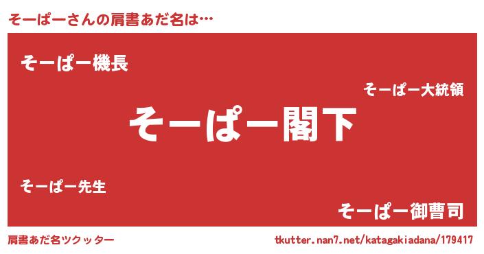 | 男性向けラノベタイトル風あだ名 | 『Re:そーぱーから始める異世界生活』 |