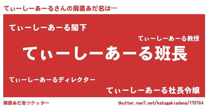 | 男性向けラノベタイトル風あだ名 | 『てぃーしーあーるの嫁は女の子じゃないと思った?』 |
