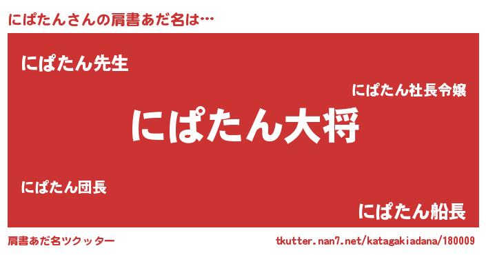 | 男性向けラノベタイトル風あだ名 | 『転生したらにぱたんだった件』 |