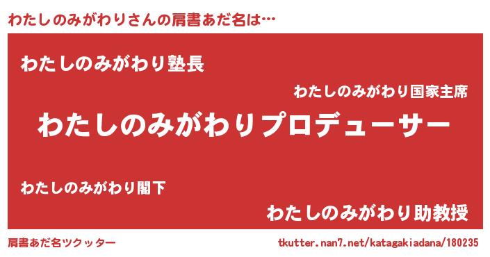 | ポケモン風あだ名 | 『ワタゴンZ』『ヒワタシノミガワリ』 |