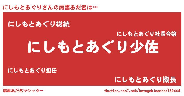 | 男性向けラノベタイトル風あだ名 | 『にしもとあぐり~年齢イコール彼女いない歴の魔法使い~』 |
