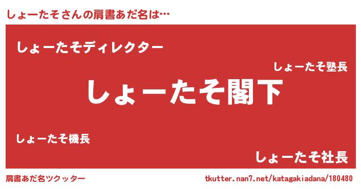 | 男性向けラノベタイトル風あだ名 | 『Re:しょーたそから始める異世界生活』 |