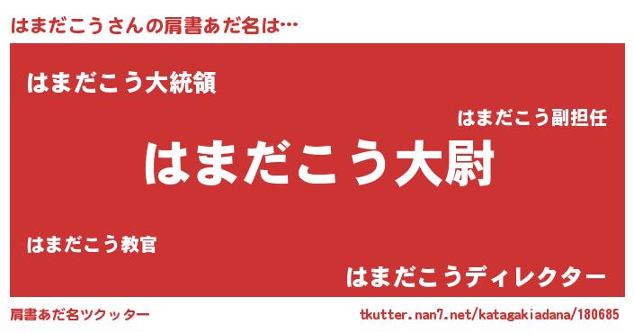| 男性向けラノベタイトル風あだ名 | 『はまだこう~年齢イコール彼女いない歴の魔法使い~』 |