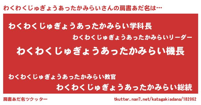 | 男性向けラノベタイトル風あだ名 | 『うちのわくわくじゅぎょうあったかみらいが世界を掌握している!』 |