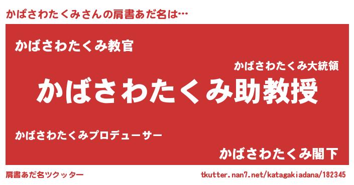 | 男性向けラノベタイトル風あだ名 | 『ノーゲーム・ノーカバサワタクミ』 |