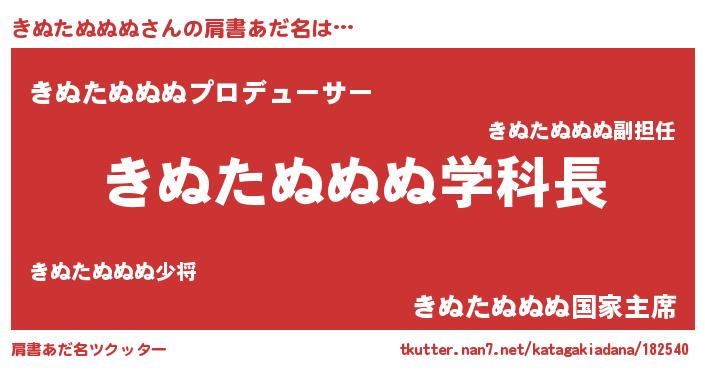 | 男性向けラノベタイトル風あだ名 | 『おまえをオタクにしてやるから、俺をきぬたぬぬぬにしてくれ! 』 |