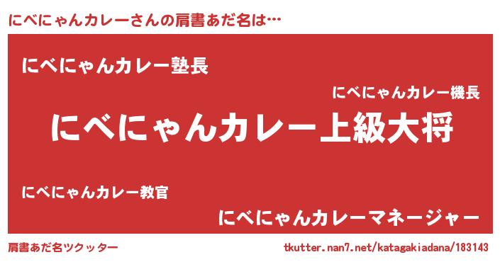 | 男性向けラノベタイトル風あだ名 | 『にべにゃんカレー~年齢イコール彼女いない歴の魔法使い~』 |