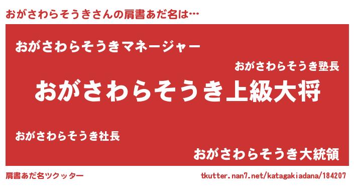 | 男性向けラノベタイトル風あだ名 | 『転生したらおがさわらそうきだった件』 |