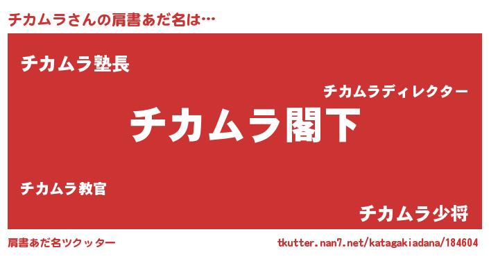 | 意味不明あだ名 | 『自称チカムラ』『たけのこ科チカムラ属』 |