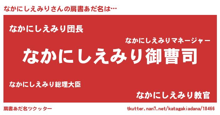 | 胡散臭い通販商品みたいなあだ名 | 『必ず成功する霊験あらたかなお札…その名も「なかにしえみり」』 |