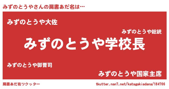 | 男性向けラノベタイトル風あだ名 | 『おまえをオタクにしてやるから、俺をみずのとうやにしてくれ! 』 |