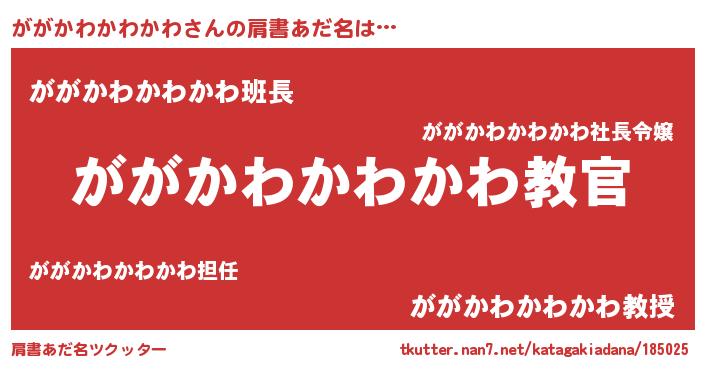 | 男性向けラノベタイトル風あだ名 | 『魔弾の王とががかわかわかわ』 |