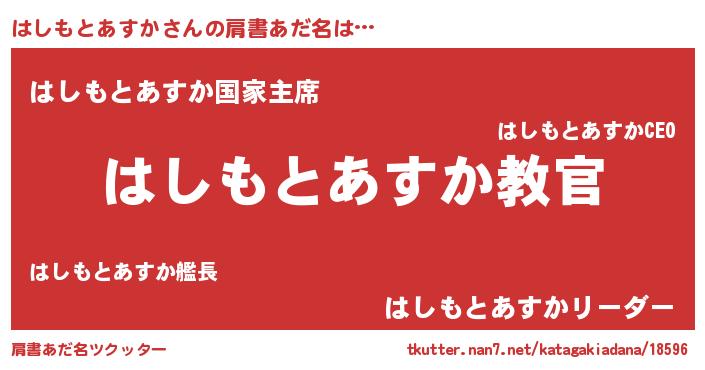 | 男性向けラノベタイトル風あだ名 | 『この素晴らしい世界にはしもとあすかを!』 |