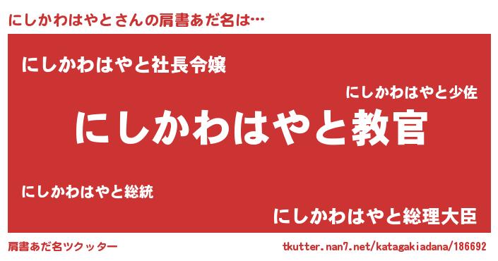 | 男性向けラノベタイトル風あだ名 | 『この素晴らしい世界ににしかわはやとを!』 |