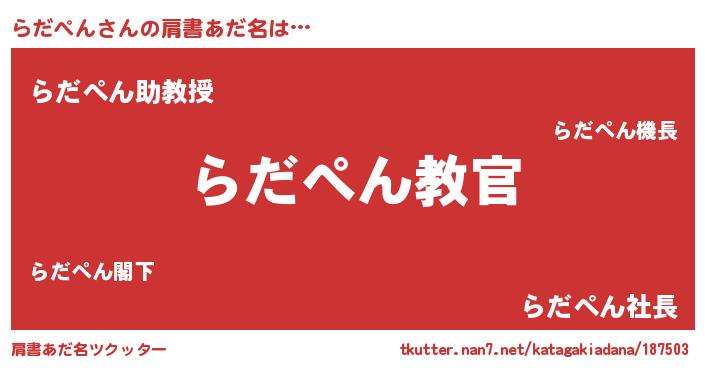 | 男性向けラノベタイトル風あだ名 | 『この素晴らしい世界にらだぺんを!』 |