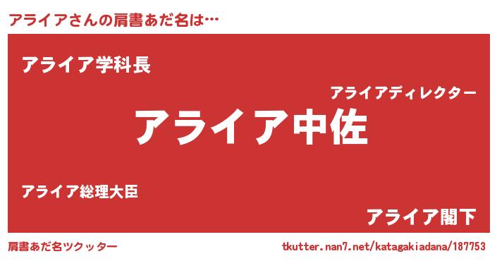 | 男性向けラノベタイトル風あだ名 | 『転生したらアライアだった件』 |