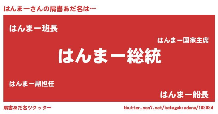 | 男性向けラノベタイトル風あだ名 | 『Re:はんまーから始める異世界生活』 |