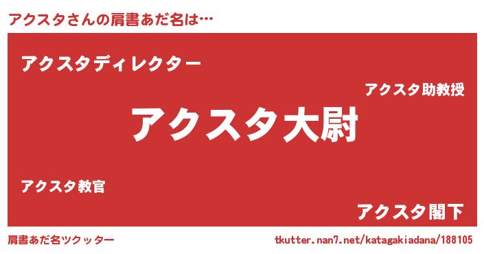 | 男性向けラノベタイトル風あだ名 | 『アクスタ~年齢イコール彼女いない歴の魔法使い~』 |