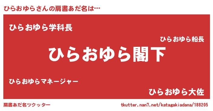 | 男性向けラノベタイトル風あだ名 | 『Re:ひらおゆらから始める異世界生活』 |