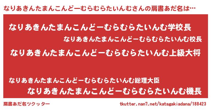 | 男性向けラノベタイトル風あだ名 | 『転生したらなりあきんたまんこんどーむらむらたいんむだった件』 |