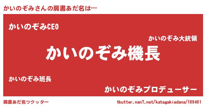 | 男性向けラノベタイトル風あだ名 | 『うちのかいのぞみが世界を掌握している!』 |