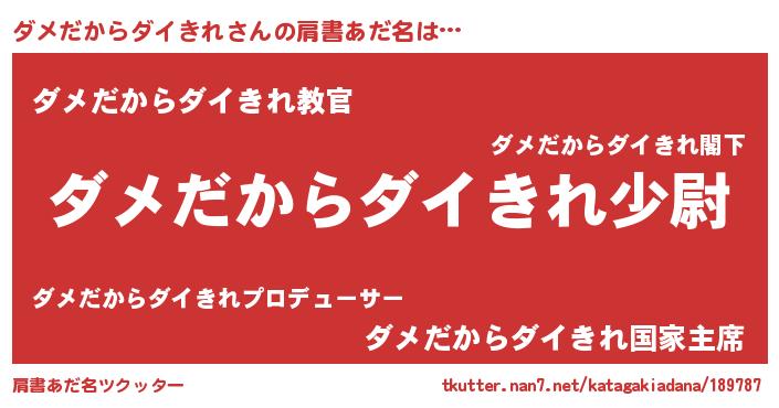 | 男性向けラノベタイトル風あだ名 | 『ダメだからダイきれ~年齢イコール彼女いない歴の魔法使い~』 |