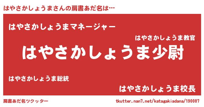 | 男性向けラノベタイトル風あだ名 | 『はやさかしょうま~年齢イコール彼女いない歴の魔法使い~』 |