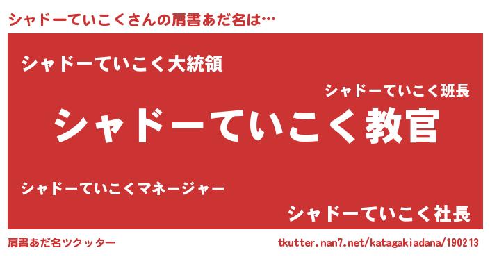 | 男性向けラノベタイトル風あだ名 | 『魔弾の王とシャドーていこく』 |