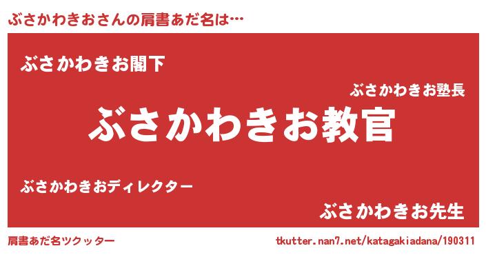 | 男性向けラノベタイトル風あだ名 | 『この素晴らしい世界にぶさかわきおを!』 |